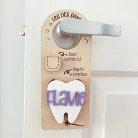 Votre enfant est déjà rendu à l'âge de perdre ses dents et vous voulez être original ? Fini le stress d'entrer dans sa chambre pendant son sommeil et de risquer de le réveiller en y déposant l'argent sous l'oreiller, avec mon accroche porte, il suffit de le mettre après la poignée de porte de sa chambre et de mettre la dent tombée dans la petite pochette. Lors de sa venue, la fée l'échangera contre une petite surprise (argent, autocollant, tattoo, etc).