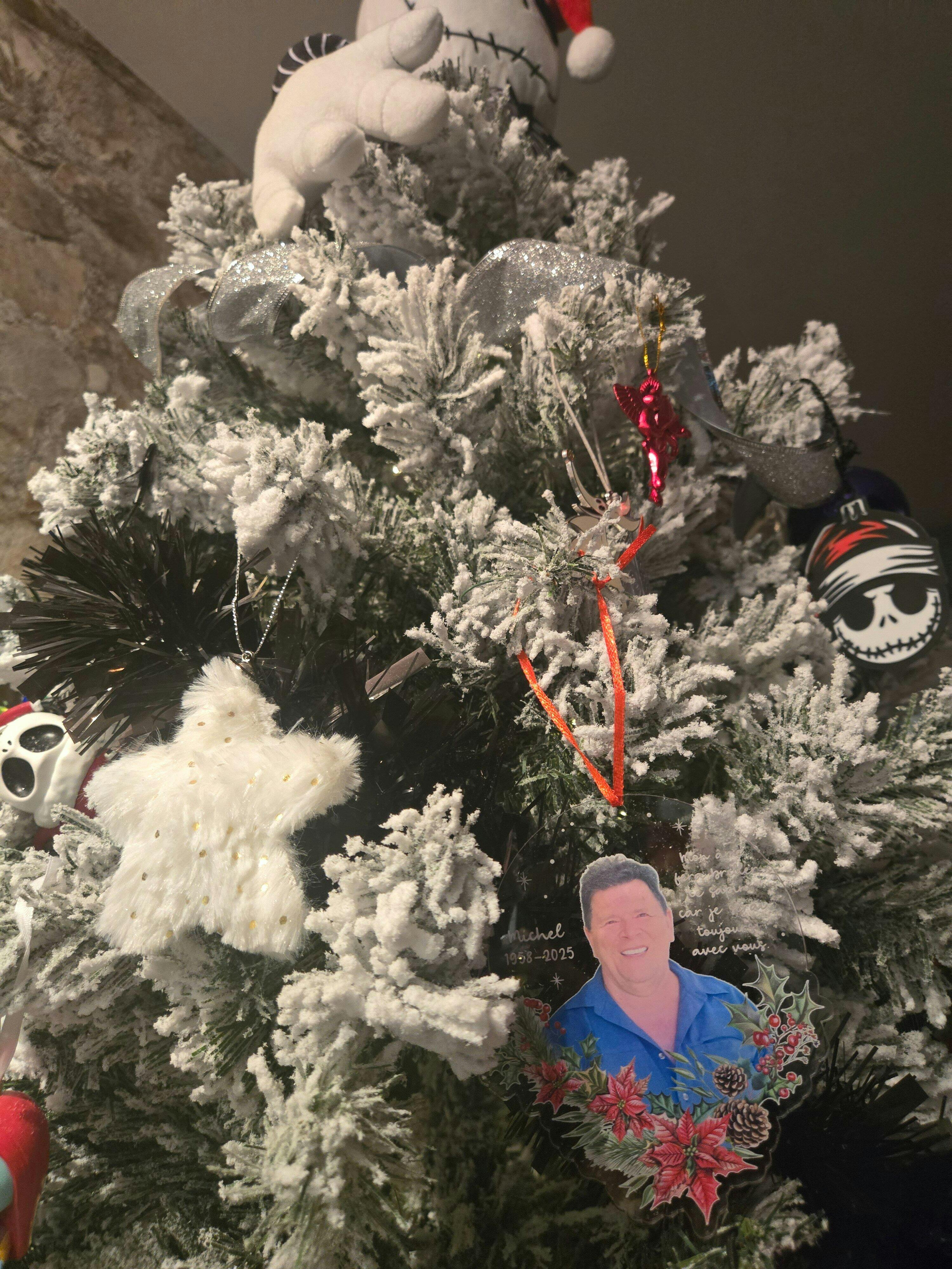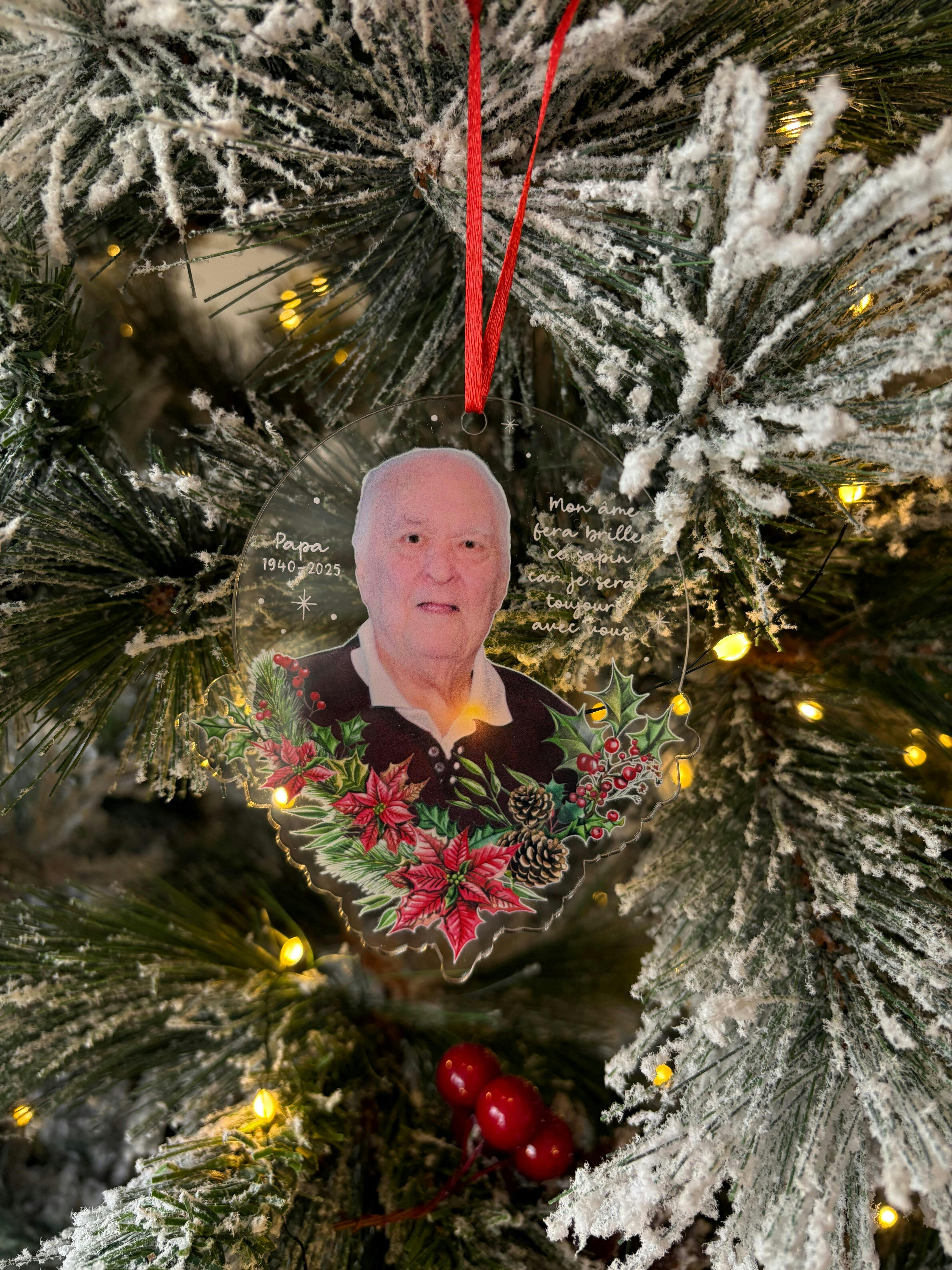 Ajoutez une touche unique à votre sapin avec cet ornement en acrylique, personnalisé d'un être cher disparu. C'est une belle façon d'immortaliser un souvenir et de rendre hommage à cette personne, que ce soit votre père, un ami ou même votre animal de compagnie. Cette décoration spéciale pourrait même être offerte à d'autres membres de la famille. Vous pouvez également changer le texte en le personnalisant.