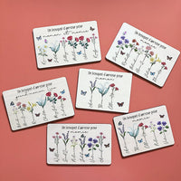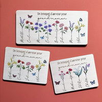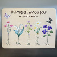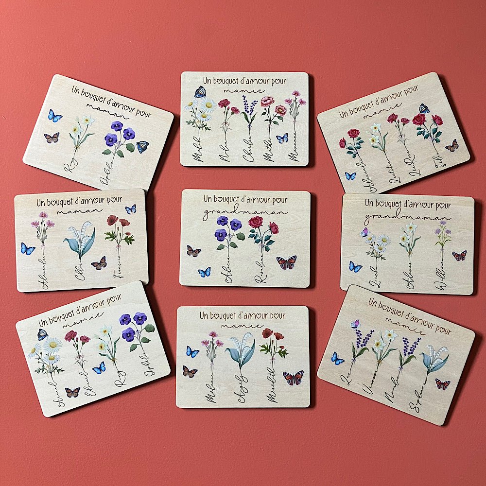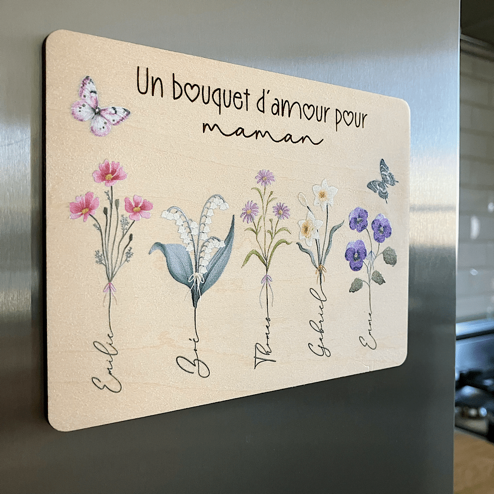 Un magnifique aimant personnalisé à offrir à sa mère ou à sa conjointe pour la fête des mères (entre autre). Les fleurs représentent les mois de naissance de chaque membre de la famille ou des petits-enfants. Cela formera un merveilleux bouquet de fleurs unique qui sera imprimé sur la plaquette de bois. Des petits papillons voleront ici et là.